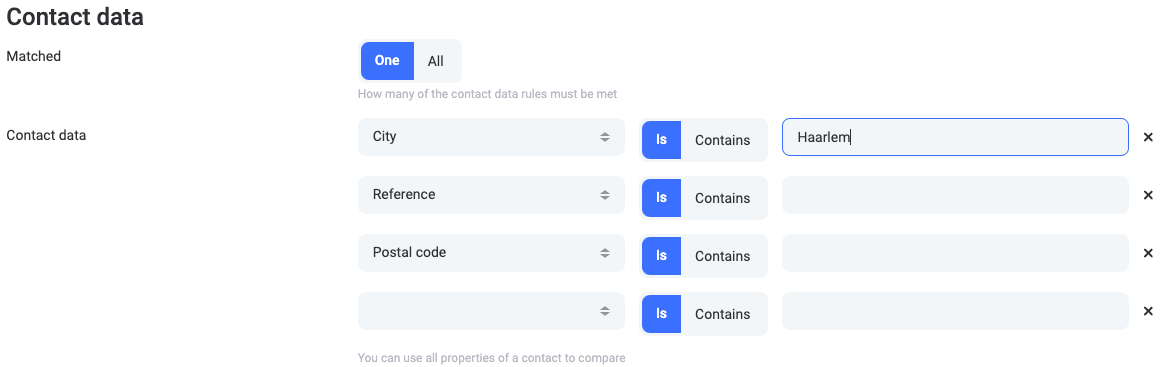 Bajo 'Detalles de contacto', puedes especificar la información que la regla debe filtrar. En la regla de ejemplo, hemos elegido que 'City' sea 'Haarlem.'