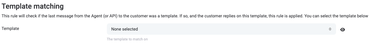 Bajo 'coincidencia de plantilla' puedes configurar la regla para verificar si el último mensaje de un usuario fue una plantilla. Con esta regla, podrías, por ejemplo, configurar que una respuesta a una plantilla específica siempre se envíe a un equipo en particular. Para este ejemplo, no estamos configurando esta opción.