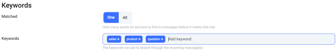 Bajo 'palabras clave', puedes configurar la regla para buscar palabras específicas en el mensaje entrante. En 'coincidencia', puedes elegir buscar una palabra o que el mensaje entrante debe contener todas las palabras.